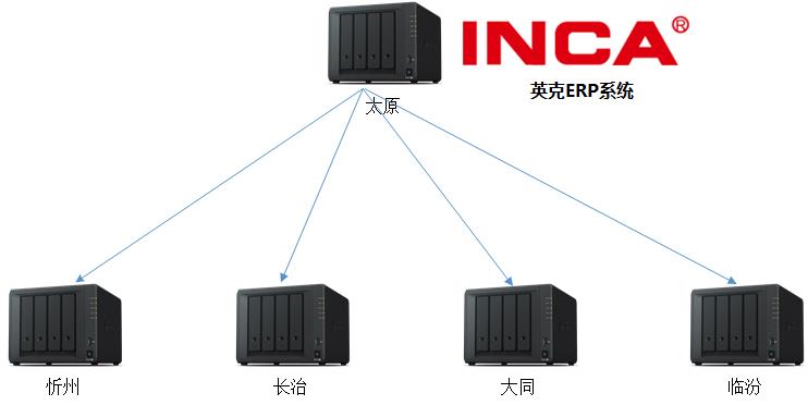 五個分公司各采購一臺DS918+,以太原為中心,向其它分公司的DS918+進(jìn)行數(shù)據(jù)實進(jìn)下發(fā)(單向),同時太原中心的存儲與英克ERP進(jìn)行了集成(JAVA二次開發(fā)),這樣,ERP的業(yè)務(wù)數(shù)據(jù)將自動存儲到DS918+的文件夾,隨后下發(fā)到其它分公司。