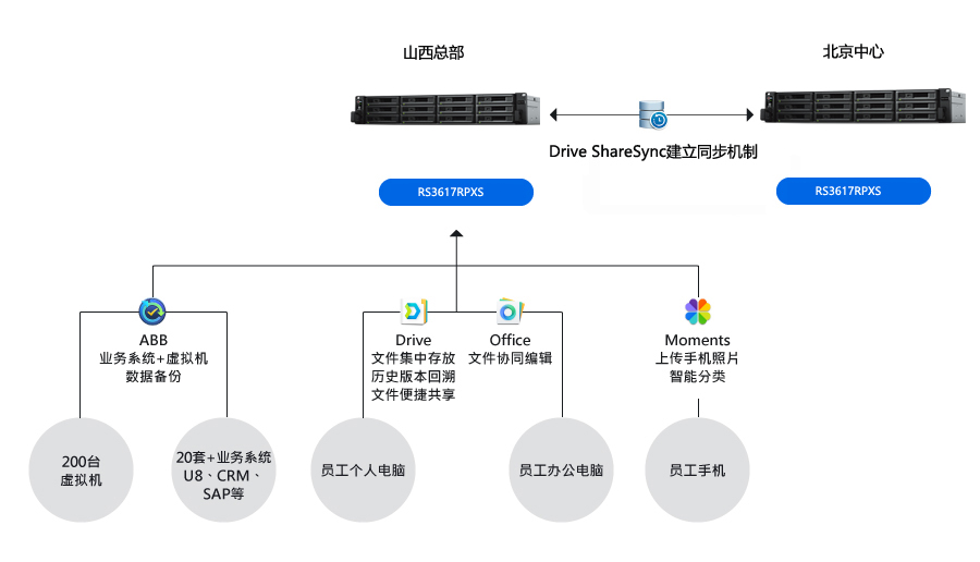 一份備份數(shù)據(jù)對(duì)公司的安全需求來(lái)說(shuō)還不夠,借用群暉又進(jìn)一步打造了異地備份容災(zāi)方案。振東制藥山西總部的 RS3617RPXS 的備份數(shù)據(jù),通過(guò)群暉 Drive ShareSync多分點(diǎn)同步功能復(fù)制到北京分公司的 RS3617RPXS 中。支持排程備份計(jì)劃。