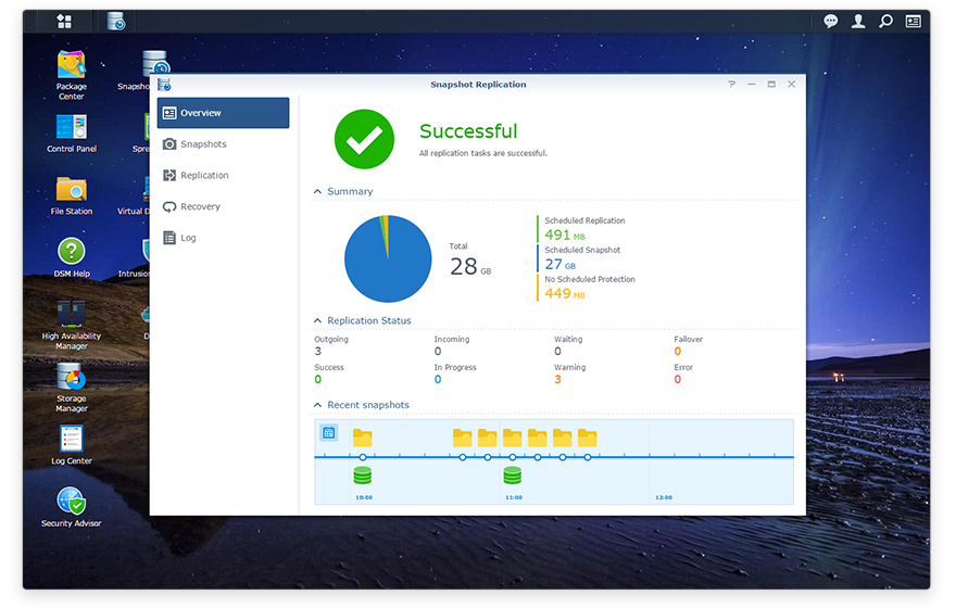 先進的 Btrfs 文件系統(tǒng)于特定 NAS 機種上支持新的快照技術。Snapshot Replication 讓你可頻繁地將數(shù)據從主要備份地點復寫到異地存儲空間 - 最多可以每 5 分鐘備份共享文件夾,每 15 分鐘備份 LUN,確保你存儲在共享文件夾的重要機密或 iSCSI LUN 中的虛擬機能從災難事件中快速地復原。