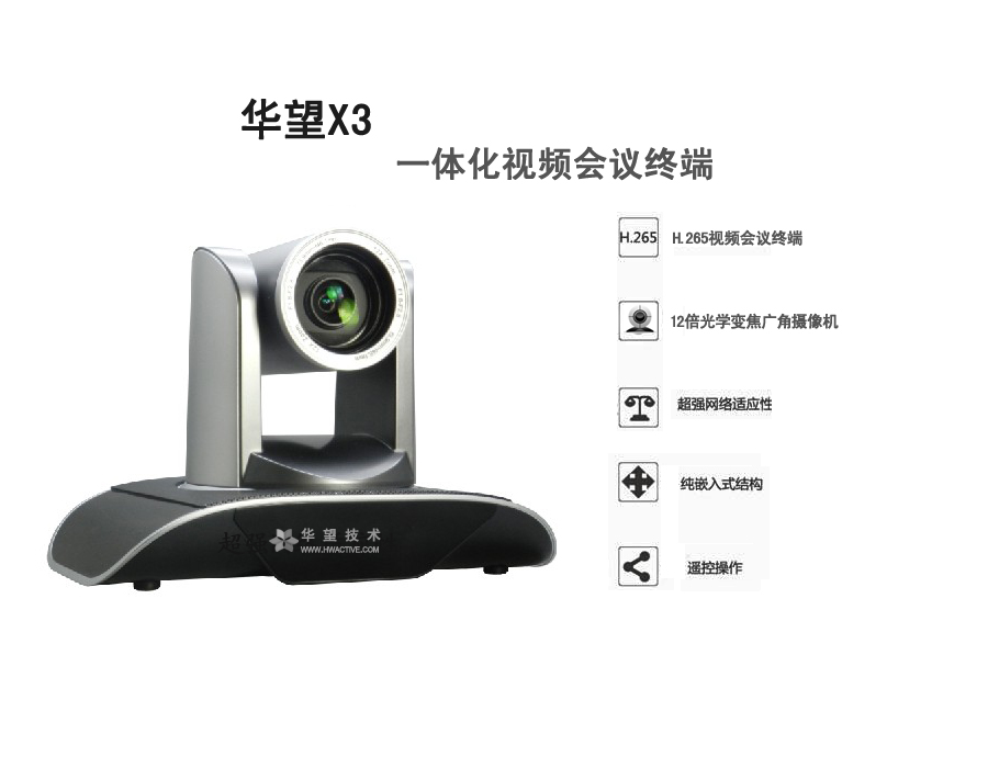 產(chǎn)品特性:內(nèi)置高清視頻會議終端+12倍光學(xué)變焦廣角攝像機(jī),安裝部署更簡單;業(yè)界首推H.265編解碼,降低40%帶寬占用;1080P高清分辨率;支持遙控器操作